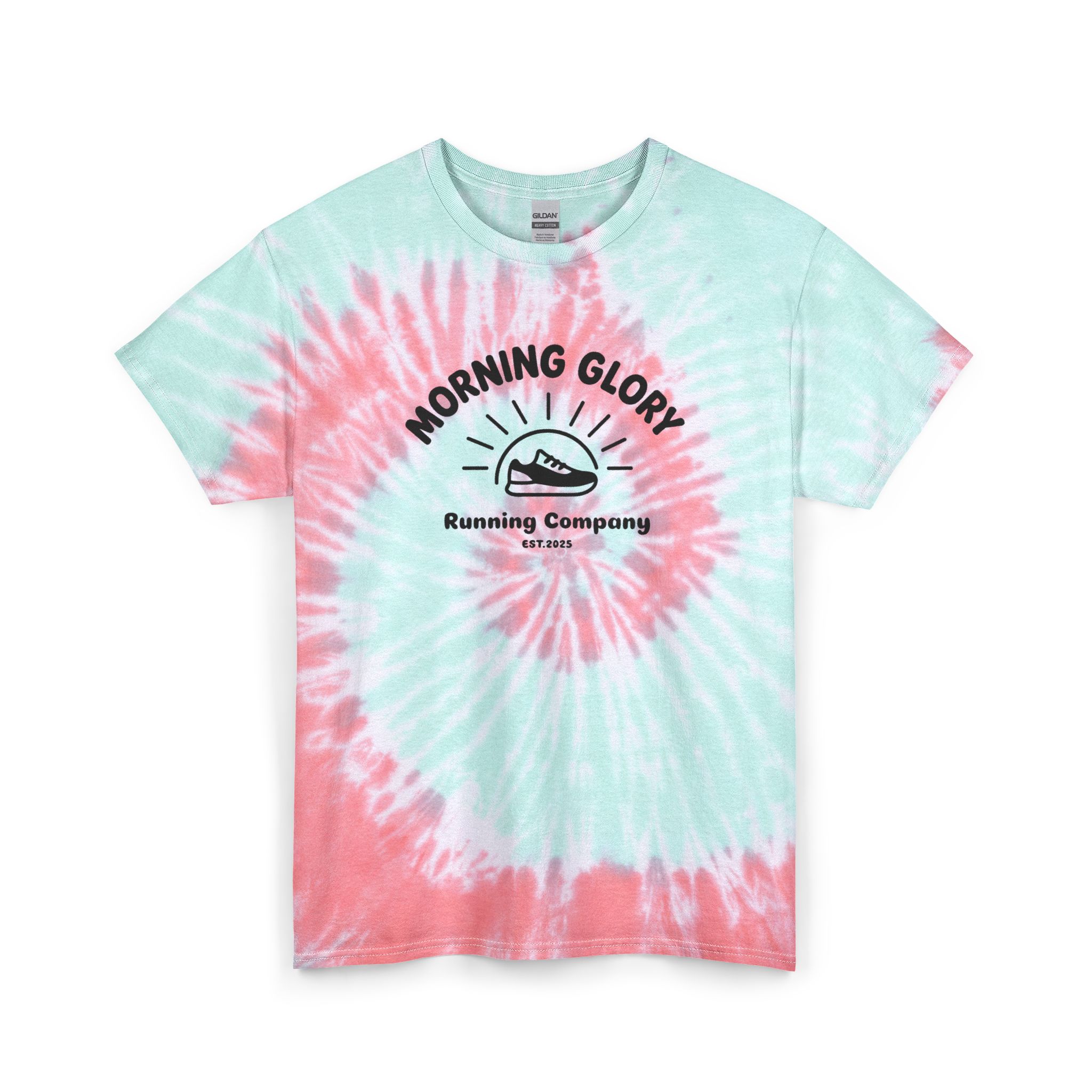 Finished with a Morning Glory Running logo on the front and a naturally worn-in tie-dye look, each shirt develops character over time — just like the routine.